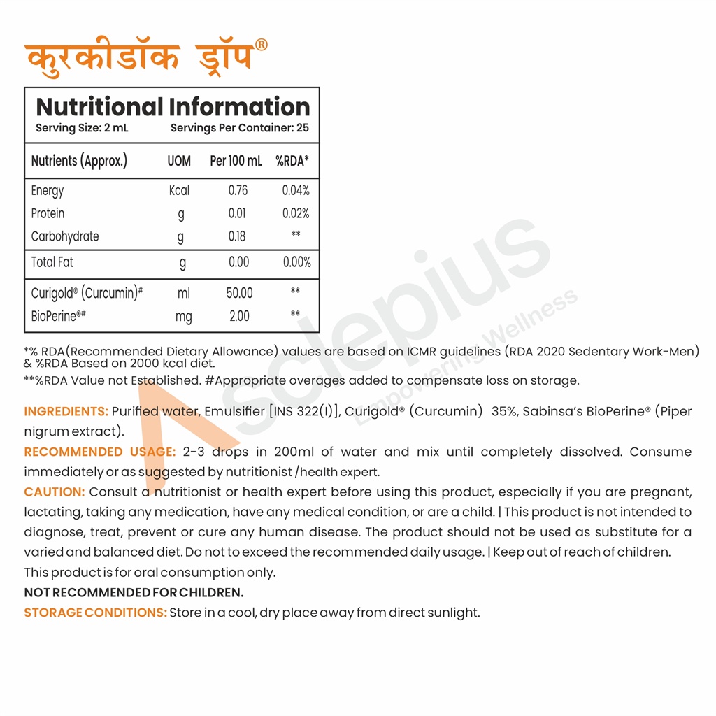 | Ingredients: | Purified water, Emulsifier [INS 322(i)], Curigold® (Curcumin) 35%, Sabinsa’s BioPerine® (Piper nigrum extract). |