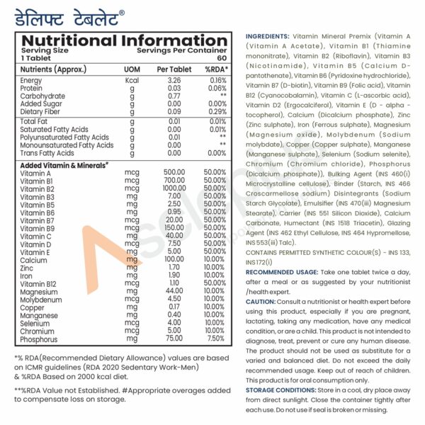 Vitamin Mineral Premix (Vitamin A, Vitamin B1 (Thiamine mononitrate), Vitamin B2 (Riboflavin), Vitamin B3 (Nicotinamide), Vitamin B5 (Calcium D-pantothenate), Vitamin B6 (Pyridoxine hydrochloride), Vitamin B7 (Biotin), Vitamin B9 (Folic acid), Vitamin B12 (Cyanocobalamin), Vitamin C (L-ascorbic acid), Vitamin D2 (Ergocalciferol), Vitamin E (D-α-tocopherol), Calcium (Calcium phosphate), Zinc (Zinc sulphate), Iron (Ferrous sulphate), Magnesium (Magnesium oxide), Molybdenum (Sodium molybdate), Copper (Copper sulphate), Manganese (Manganese sulphate), Selenium (Sodium selenite), Chromium (Chromium chloride), Phosphorus (Dicalcium phosphate), Bulking Agents (INS 460(i) Microcrystalline cellulose), Binders (Starch, INS 466 Croscarmellose sodium), Disintegrants (Sodium Starch Glycolate), Emulsifier (INS 470(iii) Magnesium Stearate), Carrier (INS 551 Silicon Dioxide), Calcium Carbonate, Humectant (INS 1518 Triacetin), Glazing Agents (INS 462 Ethyl Cellulose, INS 464 Hypromellose, INS 553(iii) Talc)