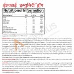 Purified Water, Immunity Extract 54%, {Ginger–Sonth 6% (Zingiber officinale), Tulsi Leaf Herb 3% (Ocimum basilicum), Black Pepper Seed Herb 3% (Piper nigrum), Dalchini Bark 3% (Cinnamomum verum), Jeera Safed Seed Herb 3% (Cuminum cyminum), Liquorice–mulethi Root Herb 3% (Glycyrrhiza glabra), Turmeric–haldi Powder 3% (Curcuma longa), Coriander -dhaniya Seed 3% (Coriandrum sativum)}}, Papaya Leaf Soft Extract Blend 15%, Herbal Soft Extract 2% {Aswagandha (Withania somnifera), Lavanga (Syzygium aromaticum), Arjun (Terminalia arjuna), Giloy (Tinospora cardifolia), Jaiphal (Myristica fragrans), Safed Musli (Asparagus adscendens), Bhrik Gokshura (Pedalium murex)}, Green Tea Soft Extract 2% (Camellia sinensis), Salt Sendha 2% (Sodium Chloride), Acidity Regulator (INS 330 Citric acid monohydrate 1%), Vitamin E 98% Liquid (DL-alpha-tocopheryl acetate), Vitamin C Plain 0.4% (L-ascorbic acid), Oil Tulsi–Basil 0.3% (Ocimum basilicum), Preservative (INS 211 Sodium Benzoate), Stabilizer (INS 415 Xanthan gum, INS 202 Potassium sorbate, INS 386 Ethylenediaminetetraacetate EDTA).
