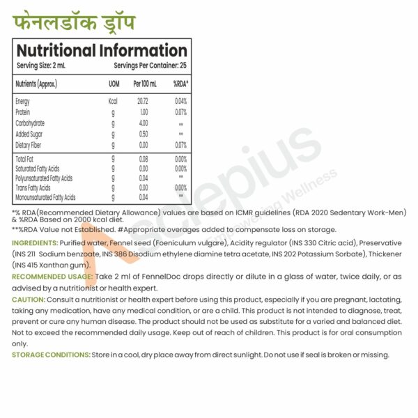 | How to Use: | Take 2 ml of FennelDoc drops directly or dilute in a glass of water, twice daily, or as advised by a nutritionist or health expert. |