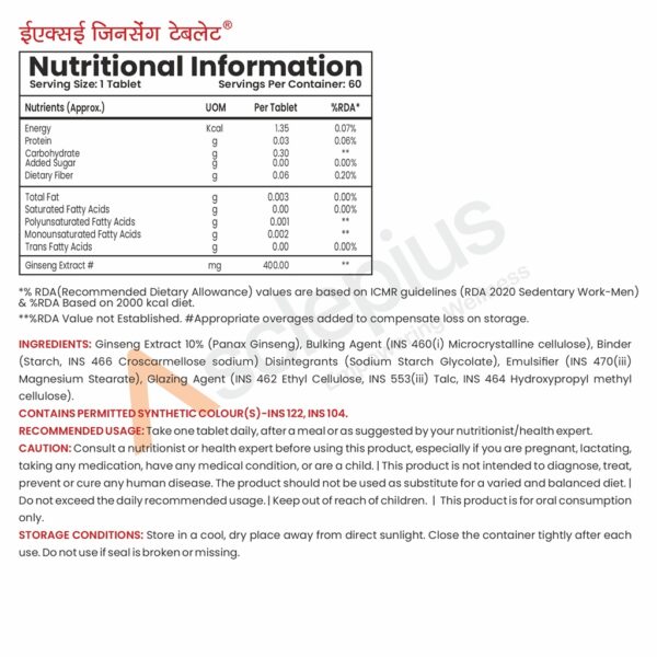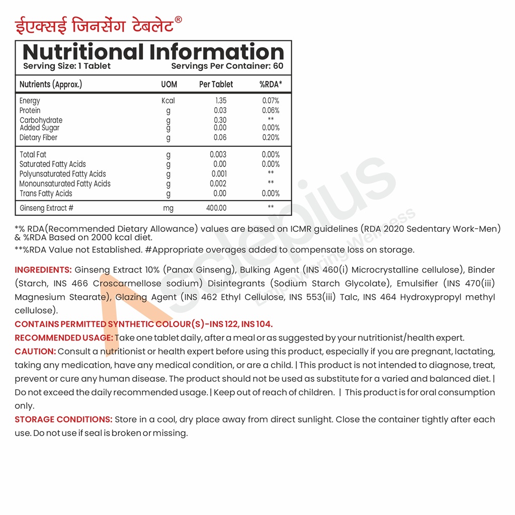 | Ingredients: | Ginseng Extract 10% (Panax Ginseng), Microcrystalline Cellulose (INS 460(i)), Starch (Binder), Croscarmellose Sodium (INS 466), Sodium Starch Glycolate (Disintegrant), Magnesium Stearate (INS 470(iii)), Talc (INS 553(iii)), Hydroxypropyl Methyl Cellulose (INS 464), Ethyl Cellulose (INS 462). |