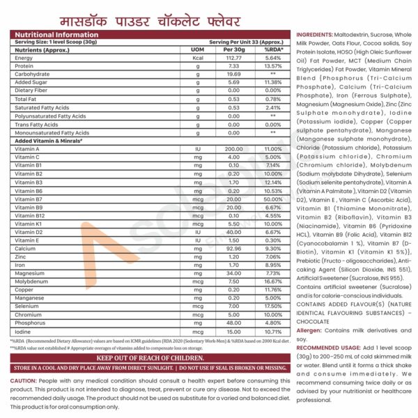 | Ingredients: | Maltodextrin, Sucrose, Whole Milk Powder, Oats Flour,Cocoa solids, Soy Protein Isolate, HOSO (High Oleic Sun lower Oil) Fat Powder, MCT (Medium ChainTriglycerides) Fat Powder, Vitamin Mineral Blend {Phosphorus (TriCalcium Phosphate), Calcium (Tri-Calcium Phosphate), Iron (Ferrous Sulphate), Magnesium (Magnesium Oxide), Zinc (Zinc Sulphate monohydrate), Iodine (Potassium iodide), Copper (Copper sulphate pentahydrate), M a n g a n e s e ( M a n g a n e s e s u l p h a t e monohydrate), Chloride (Potassium chloride), Potassium (Potassium chloride), Chromium (Chromium chloride), Molybdenum (Sodium molybdate Dihydrate), Selenium (Sodium selenite pentahydrate), Vitamin A (Vitamin A Palmitate), Vitamin D2 (Vitamin D2), Vitamin E , Vitamin C (Ascorbic Acid),Vitamin B1 (Thiamine Mononitrate), Vitamin B2 (Ribo lavin), Vitamin B3 (Niacinamide), Vitamin B6 (Pyridoxine HCL), Vitami n B 9 ( F o l i c Ac id) , Vitami n B 1 2 (Cyanocobalamin 1 %), Vitamin B7 (D-Biotin), Vitamin K1 (Vitamin K1 5%)}, Prebiotic (Fructo – oligosaccharides), Anti-caking Agent (Silicon Dioxide, INS 551), Arti icial Sweetener (Sucralose, INS 955). |